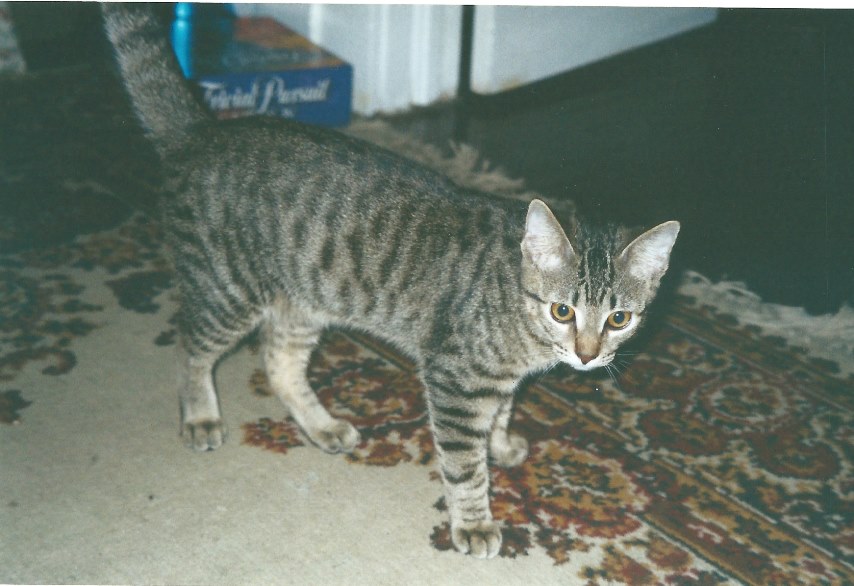Entering the home of the new abductors frightened and defiant, a defensive ball of angry striped fur. These new people, these sweaty, shaggy, uptight outlanders, one soft and one hairy, not at all like the few other people he’d had the misfortune to encounter. Liking them even less. Being carried to the bathroom, the indignity of captivity now magnified by an actual cage, one with a handle lest he forget what a portable piece of property he really was. Stashed in the bathroom, the door closing behind him, tossed again into a four-walled prison, not that the size of the cell mattered much. Passing the first day with his bristled back pressed against the rear of the cage, resisting the new people’s pitiful cajoling to come out and play. Eventually overtaken by the proverbial curiosity that was the curse and the cliché of his kind, venturing out long enough to snatch a few morsels and a lap of water from the bowls that the soft one and hairy one had left as offerings. Miraculously returning to the cage safe from harm.
